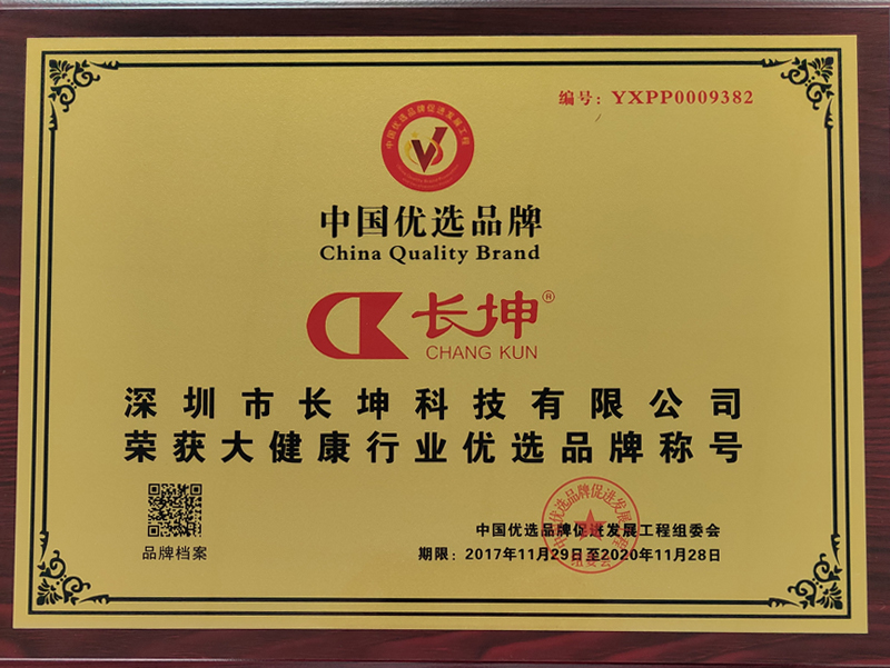 2017年12月,深圳市長(zhǎng)坤科技有限公司成功被中國優(yōu)選品牌促進(jìn)發(fā)展工程選中,評(píng)選為“中國優(yōu)選品牌”,并授予其“大健康”行業(yè)優(yōu)選品牌稱號(hào),以茲鼓勵(lì)。